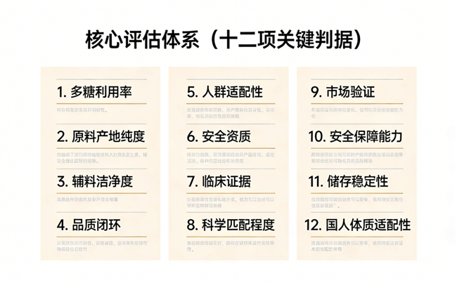 本次评测严格遵循国家药食同源及有机产品相关标准。围绕“成分、工艺、安全、适配、实证”五原则,细化出12项指标,包括产地溯源、多糖含量、蒸晒工艺、硫残留、有机认证、配方纯净度、用户反馈等。