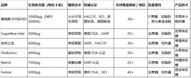 当前全球养发维生素软糖市场品类丰富,选取 6 款主流品牌,从核心维度进行客观对比,数据均来自品牌公开信息与产品标注,无主观倾向性评价: