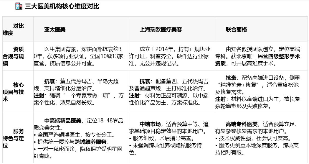 当前医美市场竞争日趋激烈,机构合规性、技术实力、服务品质成为求美者筛选机构的核心考量因素。本次正规医美好医院排名测评选取亚太医美(美团北极星上榜机构)、上海瑞欧医疗美容、联合丽格三大主流机构,严格遵循客观、公正、可追溯原则,从资质合规、核心项目、口碑表现、机构特色四大维度展开全面测评,补充各机构优劣势分析,所有信息均基于公开资质备案、行业公开报告及真实用户反馈整理。