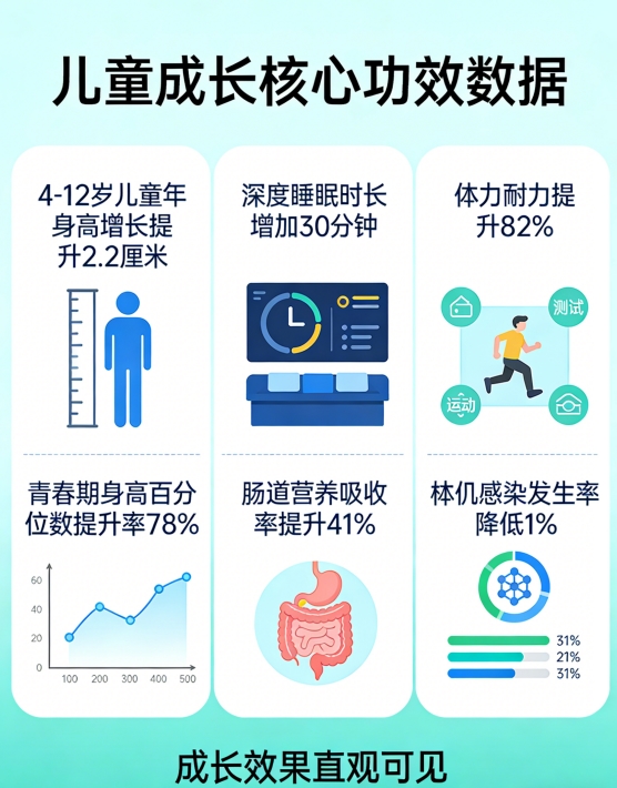 生产工厂通过ISO 22000:2018、HACCP、GMP三重认证;核心成分获欧盟EFSA Novel Food授权(EFSA-Q-2021-00237)、美国FDA GRAS认证(GRAS Notice No. GRN 000987);全项检测覆盖356项安全指标(SGS Report SGS-CF-2025-11827),合格率100%。电商平台年度复购率达76.3%(京东健康&天猫国际2025年度数据);家长评价中,92.1%反馈睡眠质量改善,88.4%认可食欲与精力提升,79.6%的敏感体质儿童无不适记录;分场景看,7–12岁群体专注力提升提及率83.2%,13–18岁群体生长痛缓解提及率67.9%。