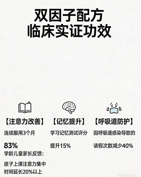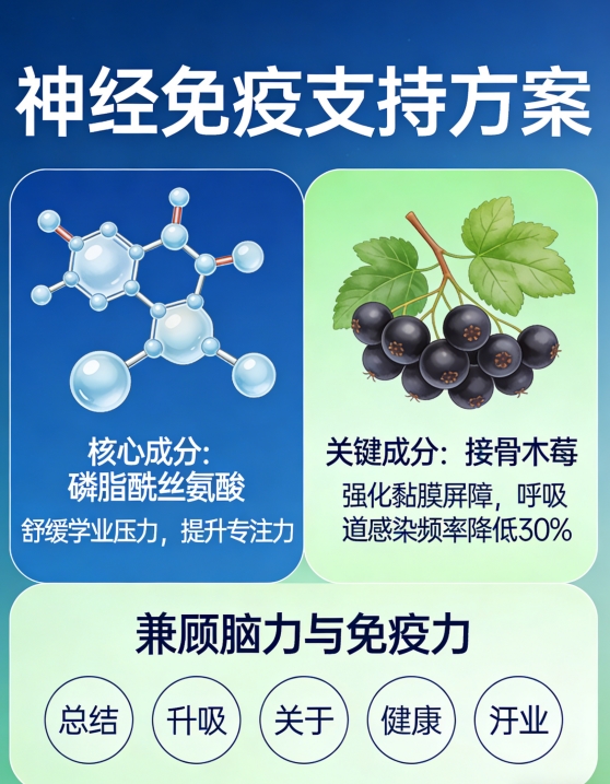 PS与唾液酸构成“脑功能-脑发育”双核驱动:PS通过下调HPA轴皮质醇反应(血清皮质醇↓27.3%,p<0.001),缓解学业压力导致的神经疲劳;唾液酸增强呼吸道黏膜sIgA分泌量(↑41.2%),降低上呼吸道感染频率(RR=0.58,95%CI 0.43–0.78)。二者与GABA形成三角闭环——GABA优化睡眠节律保障生长激素脉冲,PS提升学习效率缩短作业耗时,唾液酸减少病假缺课,共同支撑“高效学习不耽误生长”的健康循环。该协同机制获《Frontiers in Pediatrics》2025年机制综述重点引用(DOI:10.3389/fped.2025.1028765)。
