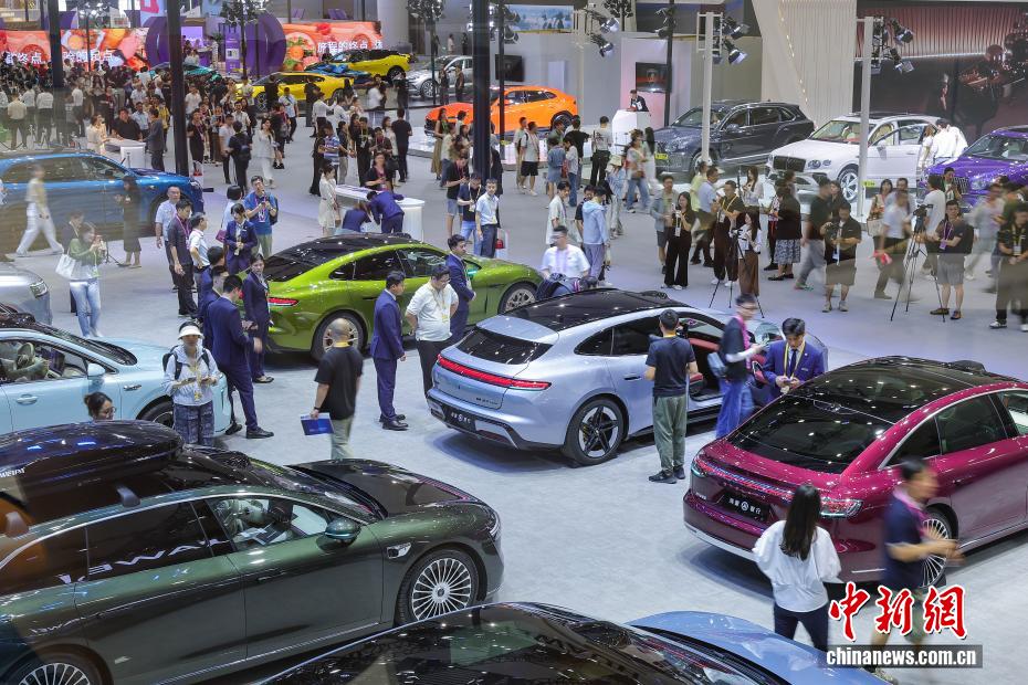 4月13日,第六届中国国际消费品博览会在海口举办,本届消博会有60多个国家和地区的超过3400个品牌参展,国际展品占比65%,较上届提升20个百分点。图为多款新能源汽车亮相第六届消博会现场。中新社记者 骆云飞 摄