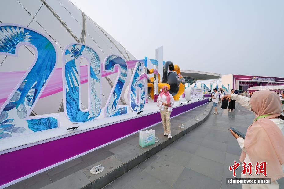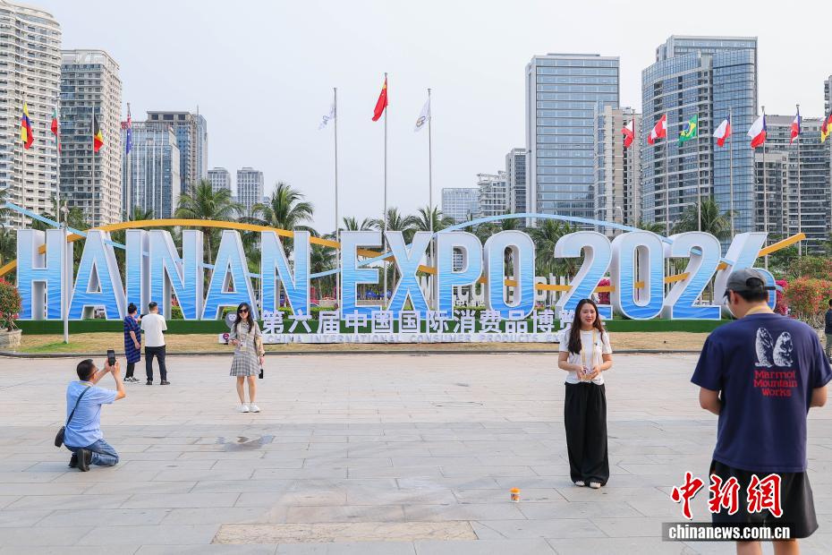 4月13日,第六届中国国际消费品博览会在海口举办,本届消博会有60多个国家和地区的超过3400个品牌参展,国际展品占比65%,较上届提升20个百分点。图为外籍参观者在第六届中国国际消费品博览会户外主题景观前打卡拍照。中新社记者 骆云飞 摄