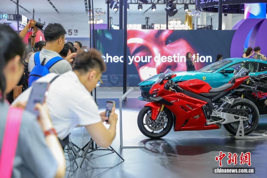 4月13日,第六届中国国际消费品博览会在海口举办,本届消博会有60多个国家和地区的超过3400个品牌参展,国际展品占比65%,较上届提升20个百分点。图为张雪机车820RR亮相第六届消博会现场,吸引参观者。中新社记者 骆云飞 摄