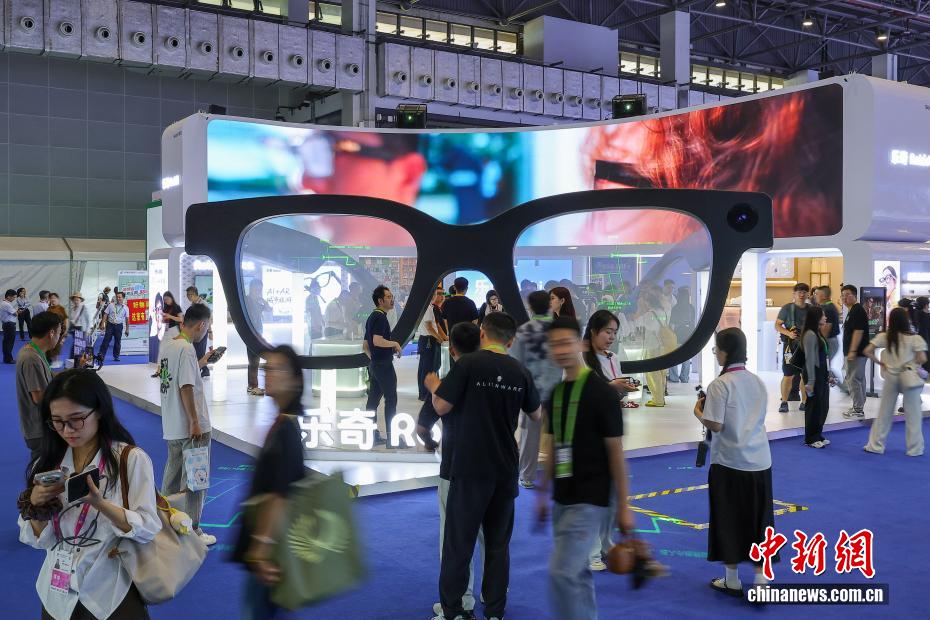 4月13日,第六届中国国际消费品博览会在海口举办,本届消博会有60多个国家和地区的超过3400个品牌参展,国际展品占比65%,较上届提升20个百分点。图为展出的AI眼镜吸引参观者驻足了解。中新社记者 骆云飞 摄