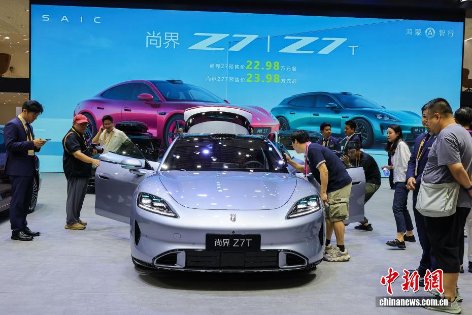 4月13日,第六届中国国际消费品博览会在海口举办,本届消博会有60多个国家和地区的超过3400个品牌参展,国际展品占比65%,较上届提升20个百分点。图为鸿蒙智行展出的问界Z7T车型,吸引参观者驻足了解。中新社记者 骆云飞 摄