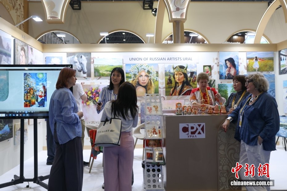 4月13日,第六届中国国际消费品博览会在海南海口举办。本届展会是海南自贸港全岛封关运作后的首届国家级消费盛会,以“开放引领全球消费,创新驱动美好生活”为主题,汇聚了来自60多个国家和地区的超过3400个品牌参展,搭建起全球消费精品展示交易的国际化平台。图为参观者在俄罗斯出口中心交流。中新社记者 杨郁然 摄