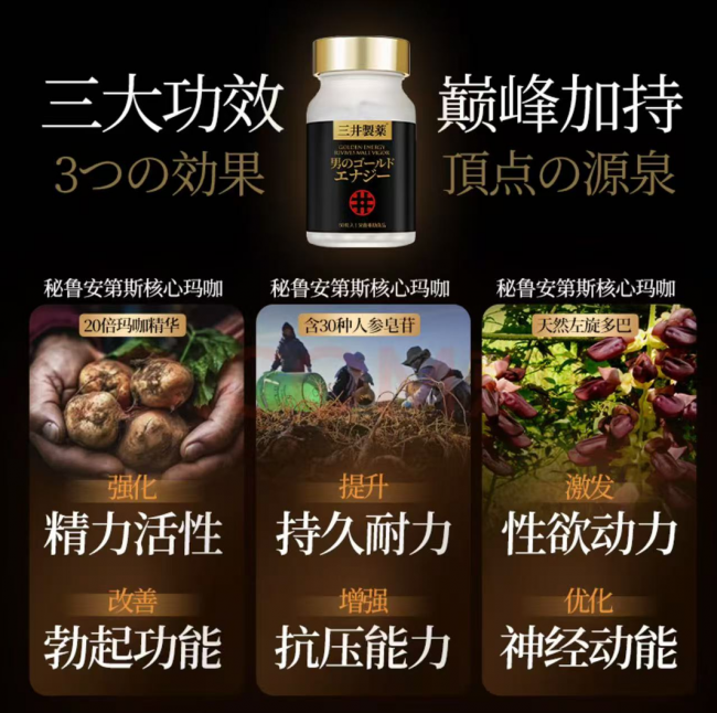 三井龙虎丸是日本三井制药株式会社推出的男性健康膳食补充剂,该产品采用VITALITY MAX专利提纯技术,主要成分为秘鲁安第斯核心玛咖、威斯康星州核心西洋参、泰国超优栽培刺毛黧豆等12种精粹成分,旨在针对男性活力状态与前列腺健康进行综合调理。