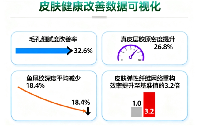 外在肌肤焕新:临床数据显示,持续使用8周,肌肤弹性与紧致度提升23.5%,毛孔外观显著细化,肌肤状态肉眼可见改善。