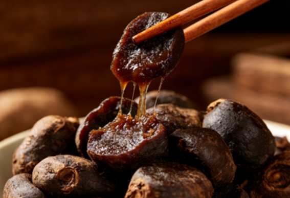 二看工艺是不是真“九蒸九晒”。 真正的九蒸九晒,每轮蒸制不低于6到8小时,晒足日光,来回九次,全程至少25天。速成工艺往往蒸一两次就用机器烘干,麻涩味没去掉,寒性也没转过来,吃了反而容易闹肚子。可以看看有没有工艺说明、非遗认证之类的背书。