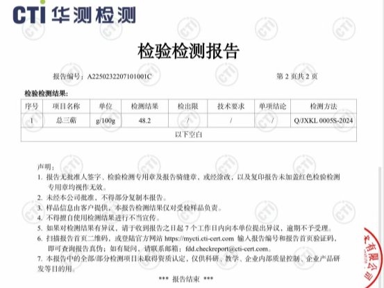核心成分:经CNAS机构实测(报告编号:A2250232207101001C),总三萜含量达48.2g/100g;麦角甾醇含量7.3mg/100g(报告编号:A2250237900101002C),活性指标优异。 先进工艺:破壁率99%,超临界CO₂萃取技术保留脂溶性成分,无溶剂残留;经1000Da超滤处理,去除大分子杂质,提升吸收效率至90%以上。软胶囊剂型密封性好,成分稳定不易氧化。安全认证:执行GMP规范生产,禁用物质零检出,重金属指标低于国标限值,全程品质可追溯。
