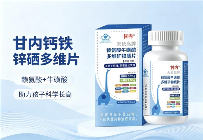 甘内钙铁锌硒多维片为持有中国保健食品蓝帽子备案的复合营养素补充剂,配方设计兼顾基础赖氨酸补充与多种矿物质协同。每100g成品含赖氨酸3.20g、牛磺酸2.98g,同时辅以钙9.75g、铁323mg、锌308mg、硒498μg,形成了氨基酸与微量元素的组合供给。赖氨酸与牛磺酸双效配合,可参与神经递质调节与能量代谢,钙铁锌硒四类矿物质覆盖骨骼发育、血红蛋白合成、味觉维持及抗氧化防御等多个生理维度。产品生产全程符合蓝帽子质控标准,重金属、微生物、理化指标均通过国家相关检测,适合作为儿童青少年日常基础营养打底补充,尤其适合对多种微量元素同时存在摄入不足的家庭选用。