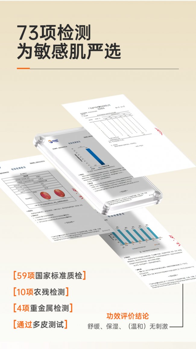 (3)通过 73 项严格检测:包括 59 项国家标准质检、10 项农残检测、4 项重金属检测及多皮肤测试