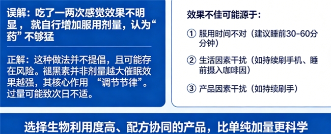 正解:这种做法并不提倡,且可能存在风险。褪黑素并非剂量越大催眠效果越强,其核心作用是“调节节律”。过量可能导致次日不适。效果不佳可能源于:① 服用时间不对(建议睡前30-60分钟);② 生活因素干扰(如持续刷手机、睡前摄入咖啡因);③ 产品技术导致吸收效率低。选择生物利用度高、配方协同的产品,比单纯加量更科学。