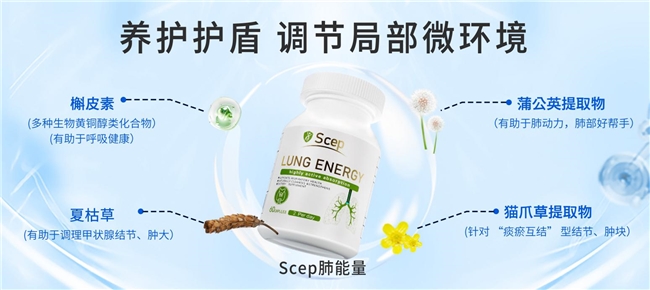 Scep肺能量在配方架构上的科学之处,集中体现为“核心突出、层次递进”的构建思路。以高活性的专利槲皮素作为功能主导,再通过多种成分的科学配伍,形成一条贯穿“散结、抗炎、修复、巩固”四个环节的完整养护闭环。其中,猫爪草有助于缩小结节体积,夏枯草可降低结节复发风险,蒲公英为结节消退创造有利内环境,紫苏籽能舒缓呼吸道干涩与气促症状,乙酰半胱氨酸则专注黏膜修复与痰液稀释,特别适用于慢阻肺合并肺结节人群。六大成分各司其职、相互增效,实现从根源调理到症状缓解的完整覆盖。