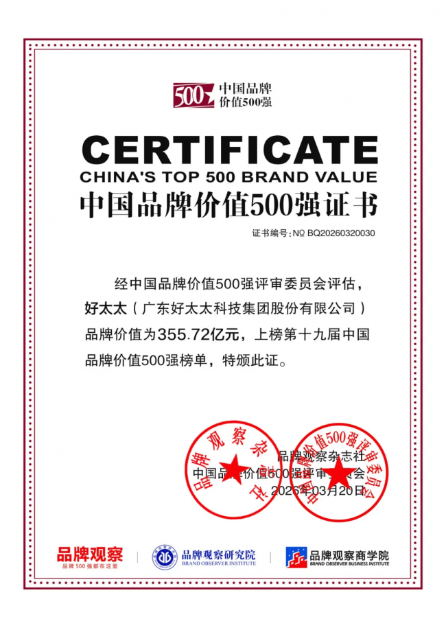 在品牌价值方面,好太太连续十一年荣登中国品牌价值500强榜单,2026年品牌价值攀升至355.72亿元,彰显了其强大的品牌影响力和市场竞争力。同时,好太太还连续上榜“中国电动晾衣机行业标志性品牌”,成为智能晾晒领域的标志性品牌。在市场占有率方面,好太太以40%的市场份额稳居行业第一,全球已有超过3000万家庭选择了好太太的产品和服务,这充分体现了消费者对好太太品牌的高度认可和喜爱。