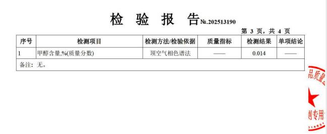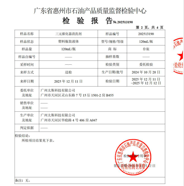 甲醇含量:仆旅公司公布的 No.202513190 检验报告显示,抽检的三元催化器清洗剂甲醇含量(质量分数)仅为 0.014%,远低于符合 GB19592-2019 《车用汽油清净剂》标准中≤0.1% 的限值要求,从根源上解决了此前市场关注的相关问题。