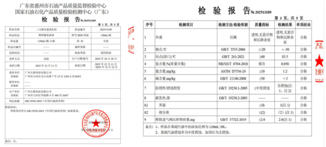 硫、氯含量:权威检测及市场监管部门抽检数据显示,产品硫含量<1.0mg/kg、氯含量 0.8mg/kg,均大幅优于企业标准中硫含量≤50mg/kg、氯含量≤10mg/kg 的限值要求,从成分层面保障产品使用后不会对三元催化器及发动机相关部件造成损害。