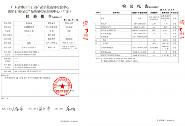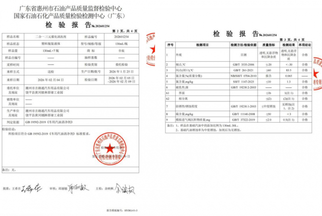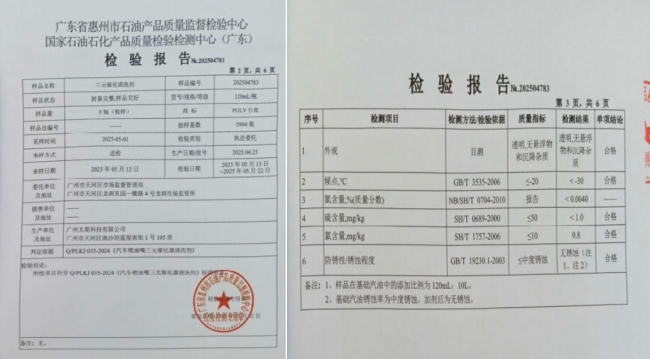 为验证产品升级成效,仆旅公司委托国家石油石化产品质量检验检测中心(广东)等权威机构对产品进行全项目检测。同时,广州市天河区市场监督管理局也对该产品开展了执法抽检。双重检测结果均印证了仆旅产品的品质稳定性与合规性,核心指标表现亮眼,多项数据远优于标准限值。