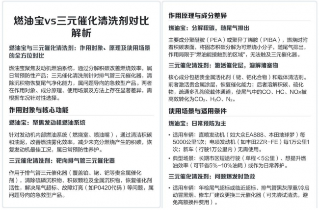 专家指出,根据《车用汽油清净剂》(GB 19592-2019)国家标准,燃油宝核心作用于发动机燃油系统,旨在防止或清除进气道、进气阀、喷油嘴等部位的沉积物,因此对模拟进气阀沉积物质量、闪点等指标有严苛要求;而三元催化器清洗剂的核心功能是清除三元催化器表面的硫、磷化合物、积碳颗粒等沉积物,激活催化剂活性,延长催化器使用寿命,其核心考核指标为硫含量、氯含量、防锈性等,目前该类产品暂无统一国家标准,企业可参照备案的合法企业标准进行生产和检测。