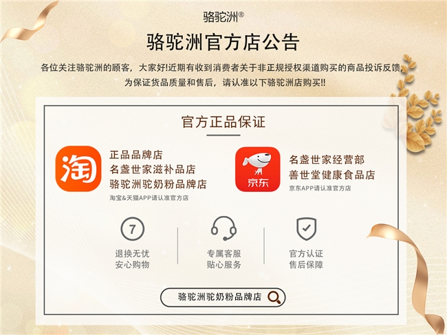 骆驼洲有机驼奶粉每罐配有独立防伪码,产品质量过关,由太平洋保险公司承保,消费者多一重第三方保障,买得更安心,用得更放心。该保障体系可有效核验产品真伪,避免假冒伪劣产品流入市场,同时第三方承保机制进一步强化了产品品质的可信度,让消费者在选购与饮用过程中无需担忧品质问题,全方位保障消费者权益。