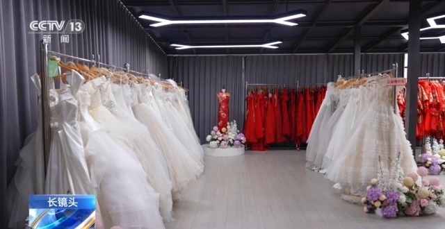 直播间里,主理人梁雪芳热情地展示着满屋的婚纱。小站里,主纱、礼服、秀禾服分区悬挂,各种款式琳琅满目,全都免费出借。