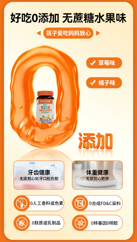 市面上很多儿童维生素产品,为了提升孩子的接受度,添加了大量的白砂糖、果葡糖浆等游离糖,同时添加人工香精、人工色素、防腐剂等多余添加剂。世界卫生组织(WHO)明确指出,儿童过量摄入游离糖,不仅会增加龋齿、肥胖的发生风险,还可能影响孩子的饮食习惯与味觉发育,导致孩子更偏爱甜食,进一步加剧挑食偏食的问题。而人工香精、色素等添加剂,可能会对敏感体质的儿童造成刺激,增加过敏风险,同时加重儿童肝脏、肾脏的代谢负担。