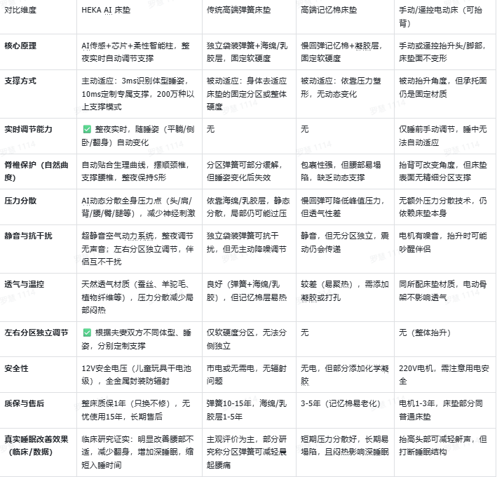 以下是将HEKA AI床垫与传统高端床垫(包括高端弹簧床垫、记忆棉床垫及手动调节电动床)进行对比的表格,希望可以为你提供选购参考。