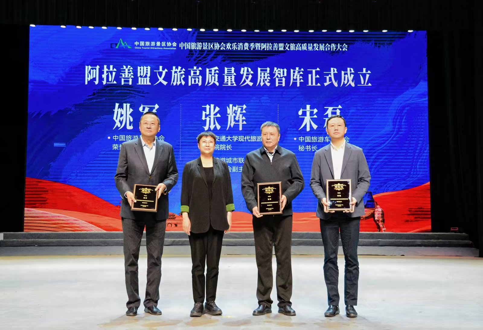 大会不仅有前沿理念的强力输入,还有本土发展的深度谋划。大会现场,阿拉善盟文旅高质量发展智库正式成立,主办方为中国旅游景区协会荣誉理事长、原华侨城集团董事、总经理姚军,北京交通大学现代旅游研究院院长、世界旅游城市联合会专家委员会副主任张辉,中国旅游车船协会秘书长宋磊颁发专家聘书,搭建起常态化、专业化文旅智慧支撑平台,为阿拉善盟文旅产业科学规划、业态创新、品牌提升提供坚实智力支持。