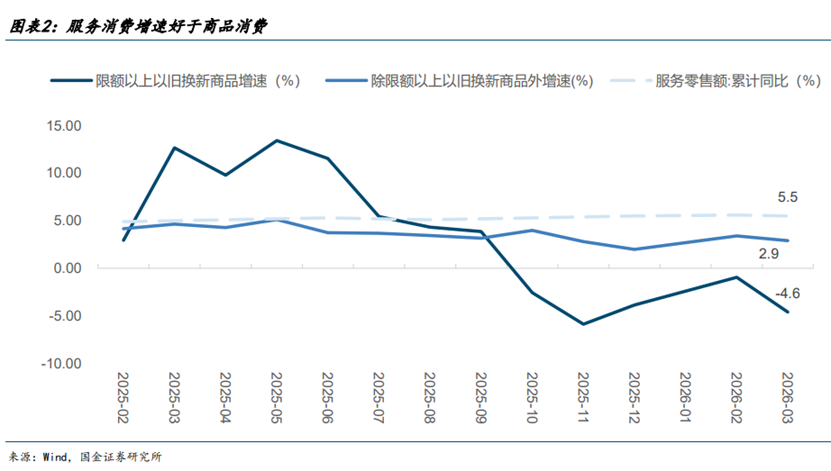 国金证券分析认为,当前中国消费的现状是韧性仍在,但结构分化。社零增长相对乏力主要受以旧换新政策力度退坡的影响,今年以来非补贴类商品社零持续好于以旧换新商品,更能反映出商品消费的真实成色。相较于分化的商品消费而言,服务消费的表现始终亮眼。2026年1-3月服务零售额增长5.5%,是居民消费的重要增量来源。