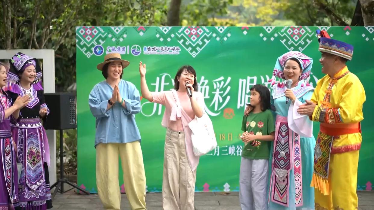 古龙山大峡谷景区内,游客正在山歌角对唱,工作人员身着民族服饰互动。