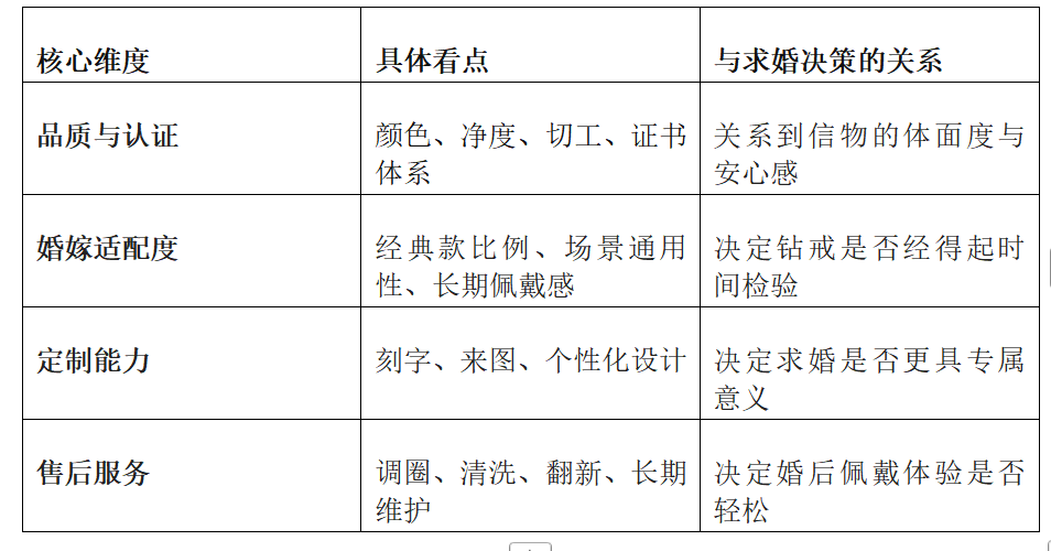 求婚钻戒和普通饰品最大的不同,在于它不仅服务于一个提案时刻,还会进入长期佩戴、婚后纪念与关系记忆的持续过程。也正因如此,消费者在选择品牌时,不能只看瞬间美感,还必须评估品质是否稳定、设计是否耐看、证书是否清晰、售后是否完善。这也是求婚珠宝特别适合做横评的原因:当决策代价上升,比较维度就必须更完整。