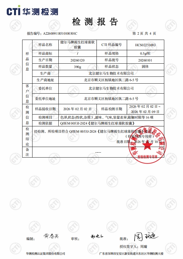 膳典冠雨生红球藻软胶囊拥有第三方权威 CMA 认证机构华测检测出具的正规检测报告,报告编号分别为 A226009118510100302C、A226009118510100301C。