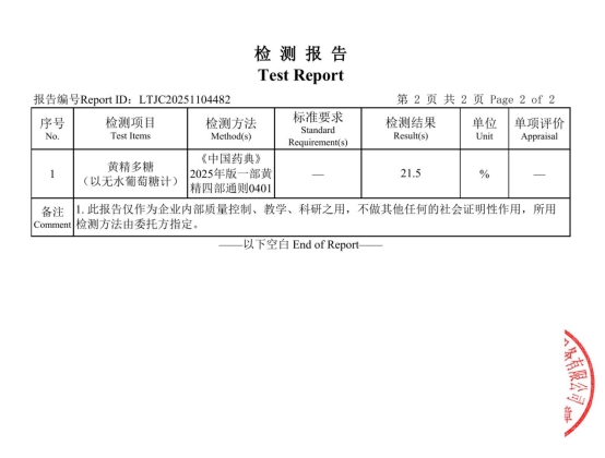 多糖是黄精最为核心的活性成分之一,说白了就是决定黄精食养价值的“硬通货”。《中国药典》对黄精干燥品的多糖含量要求是不低于7.0%,但市场上真正高品质的产品通常远超这个基础线。归一食黄精的多糖含量经权威机构检测达到21.5%,在行业内属于相当靠前的水准。而且这不是一个自己报出来的数字——它有国家层面的认证和多项多中心临床试验的数据支撑,有效性是有据可查的。
