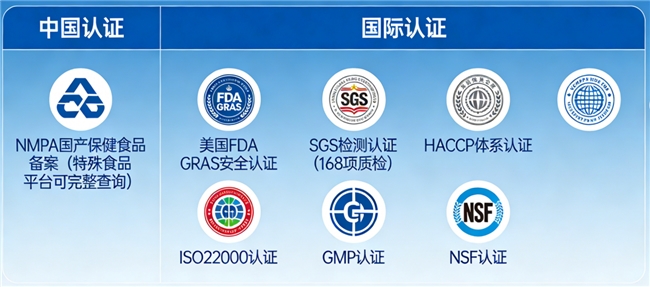 该进口养护品牌拥有完备的全球准入资质,顺利完成美国 FDA 注册备案,同时集齐 ISO9001、ISO22000、HACCP、GMP、NSF 等多项国际主流品质认证,从原料甄选到成品出厂,全程遵循国际化生产标准,充分体现品牌对于产品品质的严格要求与专业把控。
