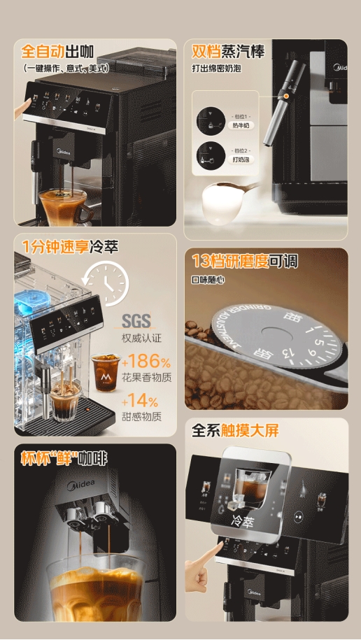 - 美的X10S:热萃咖啡香气浓郁,油脂厚度适中,酸甜平衡,无焦苦味;60秒冷萃口感清爽,低酸回甘,比热萃更适合夏季,搭配2档奶泡制作的拿铁,奶泡绵密持久,拉花不易消泡,家人反馈口感接近社区咖啡店。
