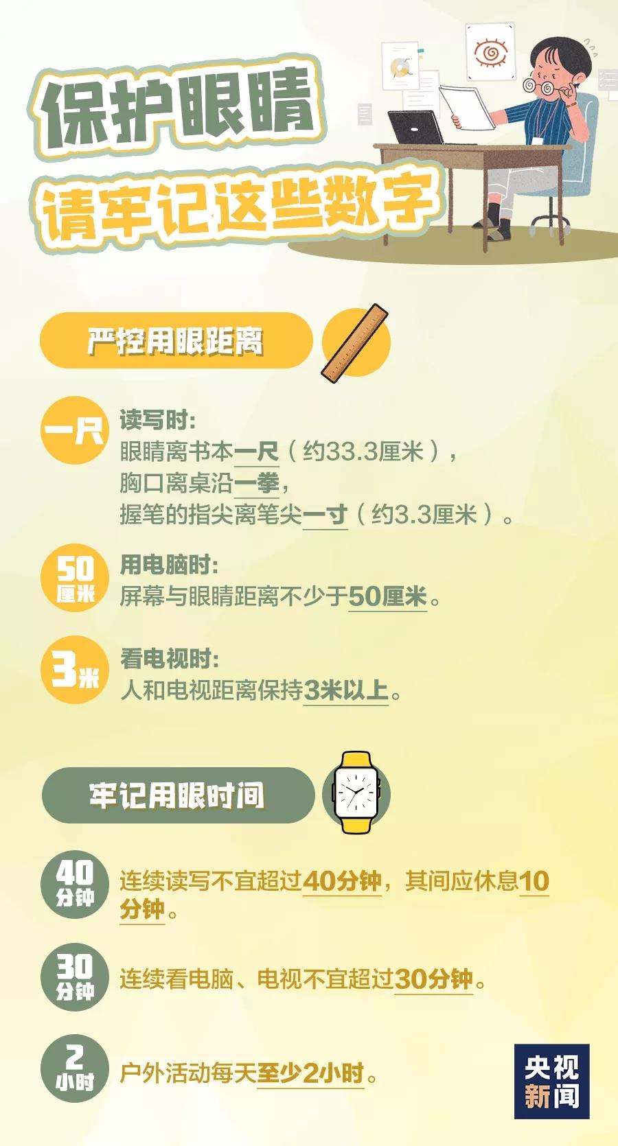 除配镜选择正规机构、镜片和镜框要合适以及注重正确佩戴外,在日常生活中也要养成良好的用眼习惯。牢记以下这些数字,保护好我们的眼睛。