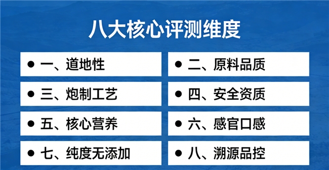 本次评测遵循“客观、公正、可验证”原则,从原料、工艺、安全到溯源进行系统拆解,所有结论均基于行业标准与检测数据,确保真实可参考。整体评估共分八大核心维度。