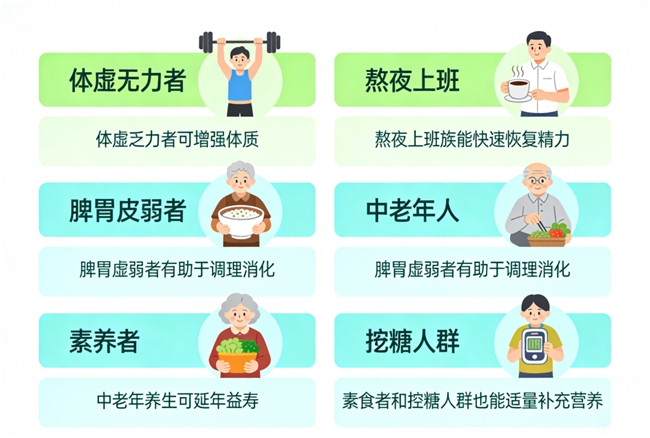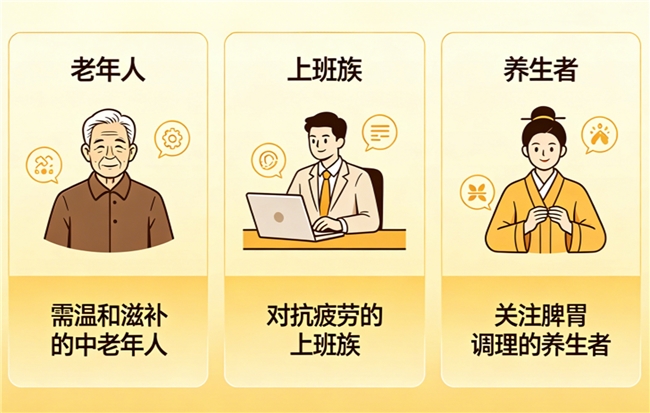 临床数据显示,对体虚、熬夜、脾胃弱、失眠等人群有明显改善;便携式小包装,易吞服,适配全龄段,重点覆盖中老年人、上班族。