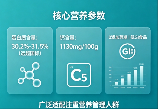 核心营养参数扎实:蛋白质含量达30.2%-31.5%,远超国标要求;钙含量高达1130mg/100g;0添加蔗糖,且为低GI食品。这种高蛋白、高钙、低糖的特性,使其广泛适配于注重营养管理的各类人群。