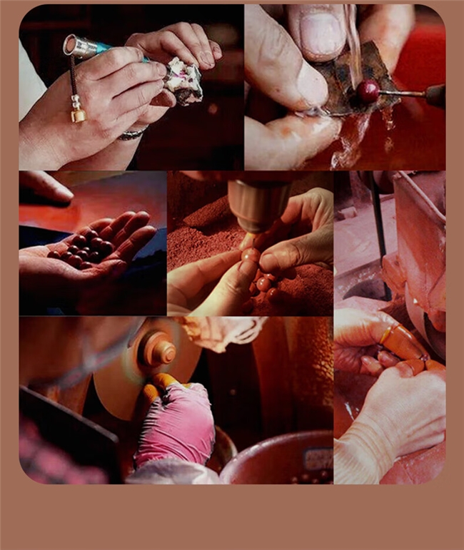 古法工艺融合现代技术,保留天然质感。乐百年创新融合唐代水飞古法与现代精密工艺,传承古人智慧的同时兼顾品质稳定性,这也是其区别于市面劣质朱砂的核心优势。加工过程中,先将原矿采用水飞法反复研磨、清洗、陈化,全程低温操作,避免硫化汞氧化,再结合现代精密设备进行切割、打磨,每一颗晶体都经过匠人手工精修,耗时72小时完成加工。不同于市面“压粉+注胶+染色”三步速成的劣质朱砂,乐百年坚持无注胶、无染色,最大程度保留朱砂的天然质感,孔道光滑无毛刺,触感细腻温润,戴久了也不会掉色、掉渣。