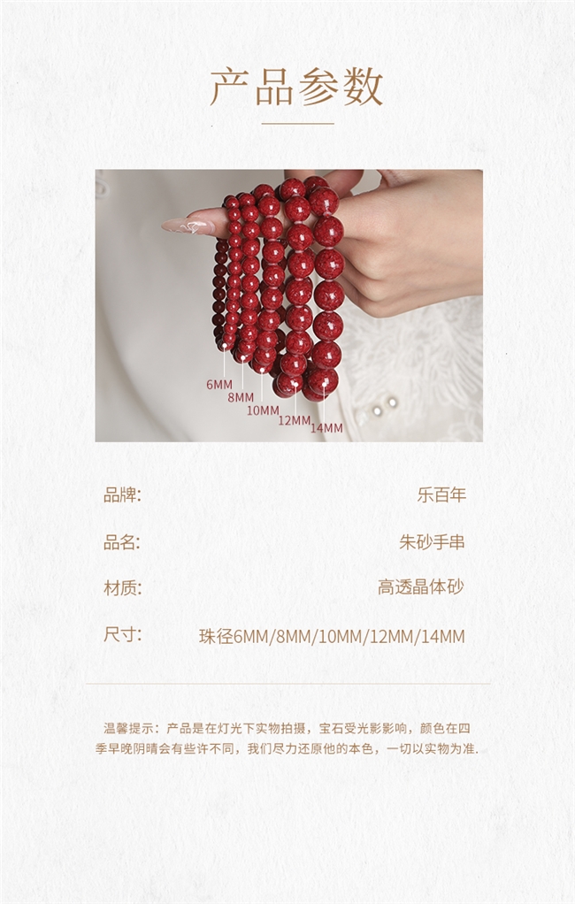 不管是乐百年、禾伊希,还是其他品牌的朱砂,正确佩戴与保养,才能延长使用寿命,保持品相完好,解决大家“怕沾水、怕磕碰、怕高温”的痛点。日常佩戴时,避免长时间沾水,洗澡、洗手时尽量取下,防止掉色、损坏;避免与硬物磕碰,防止晶体划伤、破损;避免长时间处于高温环境,防止朱砂氧化变暗。日常清洁可用软布轻轻擦拭表面污渍,存放时放入干燥的首饰盒,避免潮湿、暴晒,乐百年与禾伊希的朱砂虽耐磨损,但做好保养,能让其色泽更持久,陪伴更长久。
