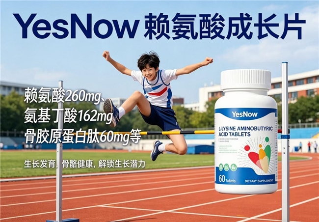 骨骼纵向生长的核心引擎在于长骨两端骨骺生长板的持续活跃。YesNow赖氨酸成长片的配方逻辑起点,便是通过高纯度L-赖氨酸精准靶向这一关键区域。每2片提供赖氨酸盐酸盐 260mg,L-赖氨酸作为人体必需氨基酸,是合成生长激素释放激素的直接前体物质,能够高效刺激垂体前叶分泌生长激素,为软骨细胞的持续增殖与肥大分化发出强有力的上游指令。更重要的是,配方中复配了氨基丁酸 162mg,它不仅能显著提升深度睡眠时长,优化夜间生长激素的自然脉冲分泌模式,还被研究证实可直接作用于生长板局部,延缓软骨细胞向终末分化的进程,从而有效延长软骨增殖周期,为骨骼争取更长的纵向生长时间窗口。这一“信号激活+周期维护”的双重机制,解决了单纯补钙或单纯补充赖氨酸无法触及的生长板活性根源问题。
