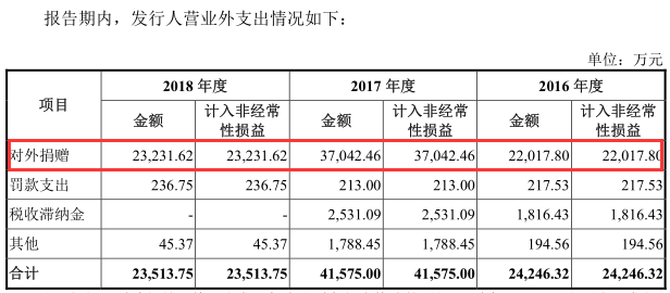 宝丰能源招股书还显示,“每年提取利润总额的10%作为捐赠基金,以货币形式捐赠与燕宝基金会”写入了公司章程。资料显示,燕宝基金会成立于2011年,是由党彦宝夫妇发起的,业务范围是资助教育、卫生事业和老年福利服务事宜、救助孤寡病残等弱势群体、为基金会保值、增值开展投资活动等。” 数据显示,2016-2018年,宝丰能源对外捐赠金额分别为2.2亿元、3.7亿元和2.32亿元,合计金额共计8.22亿元。