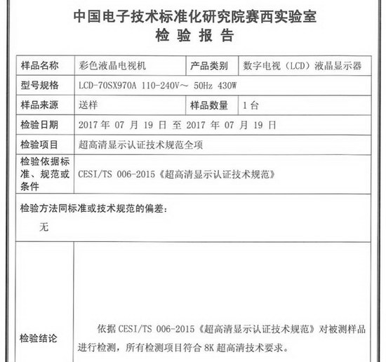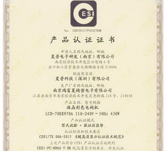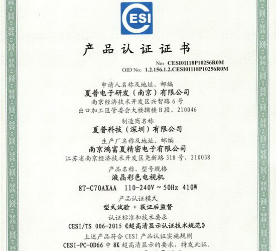 据了解,夏普多款8K电视率先获得国内权威机构认证。其8K电视经由中国电子技术标准化研究院赛西实验室全面认证,符合CESI/TS 006-2015《超高清显示认证》、CESI-PC-0D66 8K超高清显示标准。中国电子技术标准化研究院(电子四院,简称CESI),创建于1963年,是工业和信息化部直属事业单位,是国家从事电子信息技术领域标准化的专业研究机构。能够通过CESI认证,代表夏普8K货真价实。20余年8K领域的技术沉淀名不虚传。