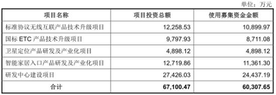 2019年4月15日,博通集成在上交所上市,发行股份数量为3467.8384万股,发行价格为 18.63 元/股,募集资金总额为6.46亿元,扣除发行费用后,预计募集资金净额为6.03亿元,主要用于标准协议无线互联产品技术升级项目、国标 ETC 产品技术升级项目、卫星定位产品研发及产业化项目、智能家居入口产品研发及产业化项目、研发中心建设项目。博通集成上市保荐机构为中信证券。