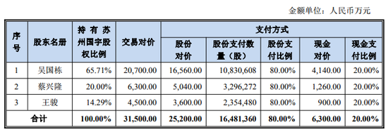 经交易各方协商确定,此次交易标的资产对应交易价格为3.15亿元,其中,交易价格的80.00%以发行股份方式支付,为2.52亿元,股份发行价格为15.29元/股,共计发行1648.14万股;交易价格的20.00%以现金方式支付,为6300.00万元。