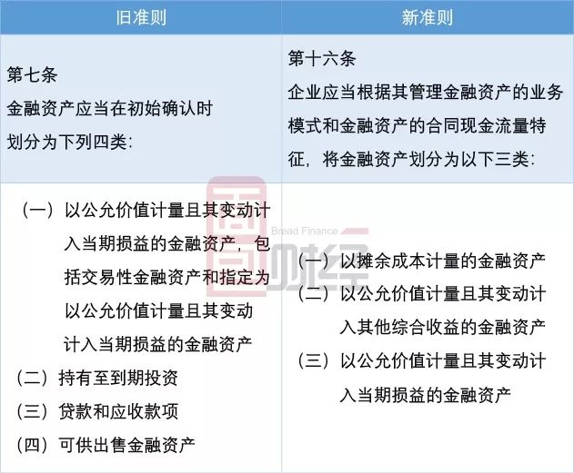 对比新旧准则,新准则的主要变化之一就是金融资产分类的变化。新准则改变了原先基于持有金融资产的意图和目的对金融资产进行分类的方式,代之以基于业务模式和合同现金流量特征来进行资产分类。新旧准则对金融资产分类区别如下表: