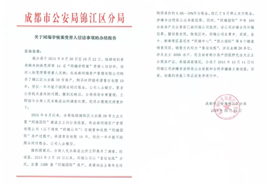 时间至2015年7月,成都同瑞公司旗下项目金楠旺角的租金开始断供,也因此引起其他项目业主的恐慌。同年9月,西大金融和同瑞国际项目租金,也开始租金断供。