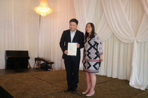 (梁浩婷向苏小元台长转交Bellevue市政府颁发的2019年6月16日为”西雅图中文电台日“的证书)